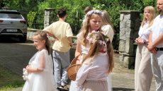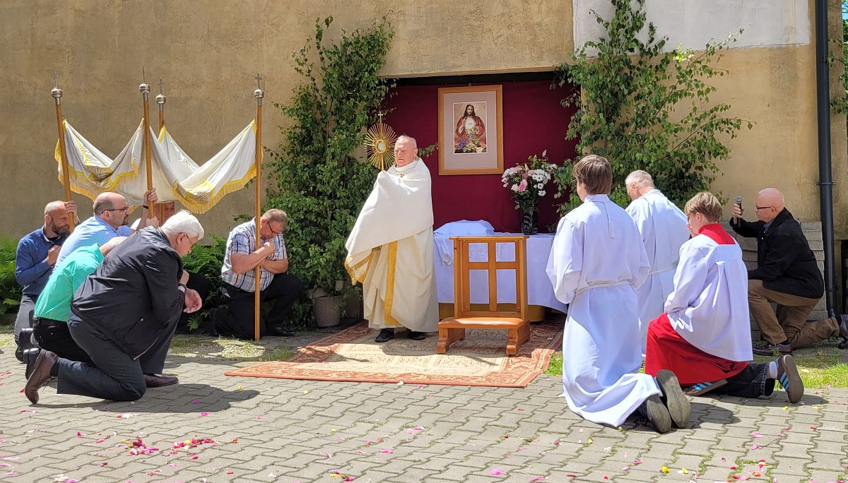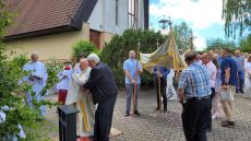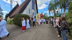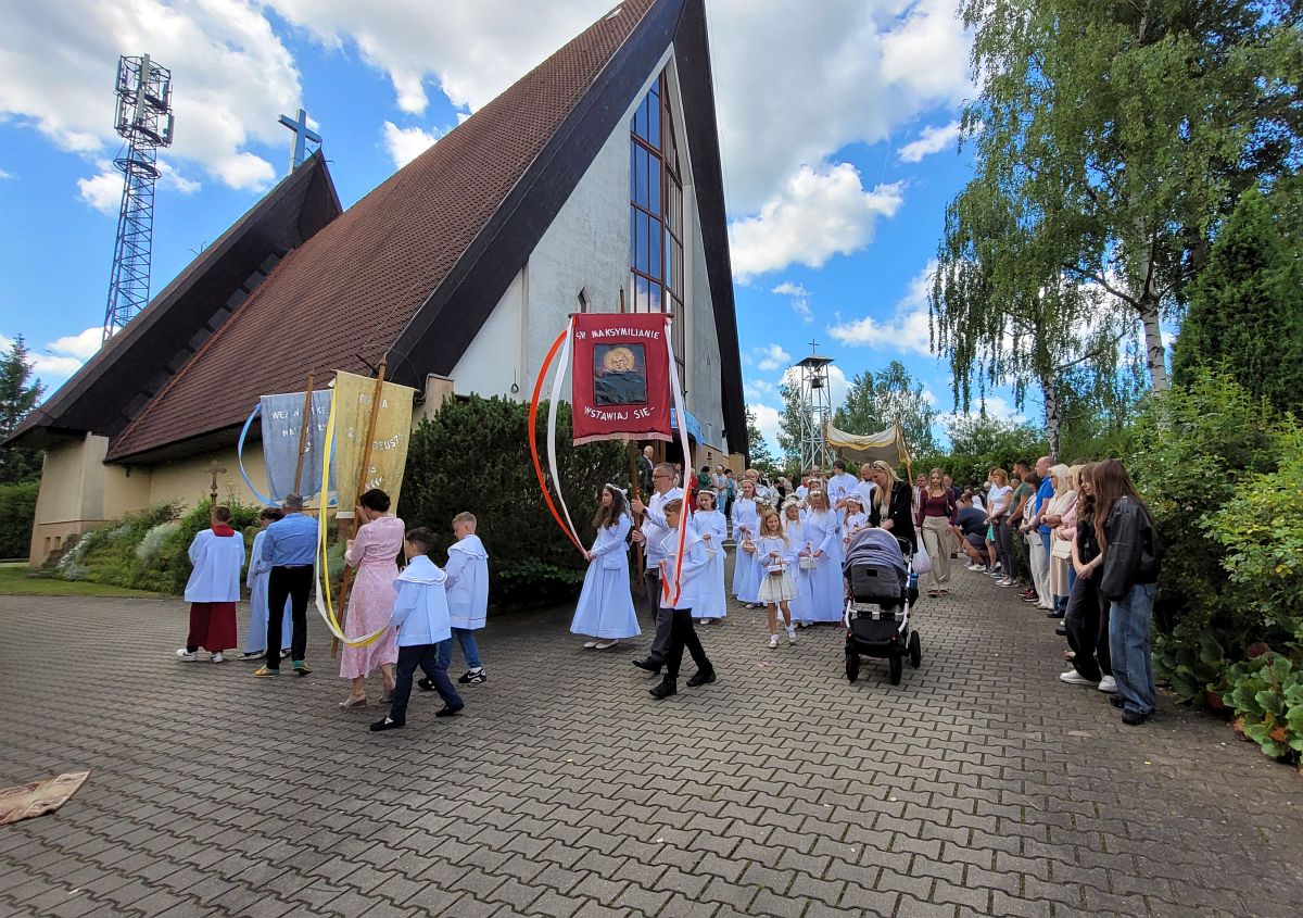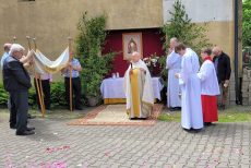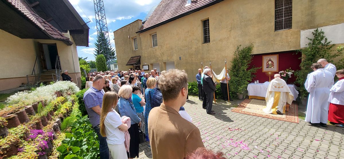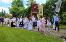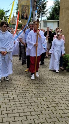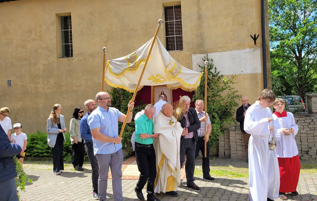 W czwartek 19 czerwca obchodziliśmy uroczystość Najświętszego Ciała i Krwi Chrystusa. Po mszy świętej o godz. 11.00 wyruszyliśmy z procesją do czterech ołtarzy. W tym roku ze względu na chorobę Księdza Proboszcza, procesja odbywała się wokół kościoła. Przygotowaniem ołtarzy wokół kościoła zajęły się tylko 3 Panie z parafii. Tym bardziej należy się im wdzięczność za pracę i zaangażowanie, bo oprawa święta była uroczysta. Udział w procesji wzięły m.in. dzieci pierwszokomunijne i obchodzące rocznicę Pierwszej Komunii świętej w strojach komunijnych. Dziękujemy wszystkim osobom za niesienie feretronów, baldachimu, za przygotowanie dziewczynek do sypania kwiatów oraz za wszelką pomoc w przygotowanie uroczystości.