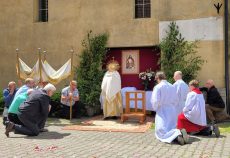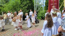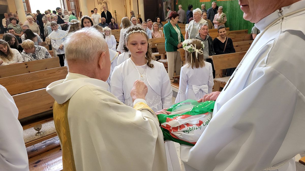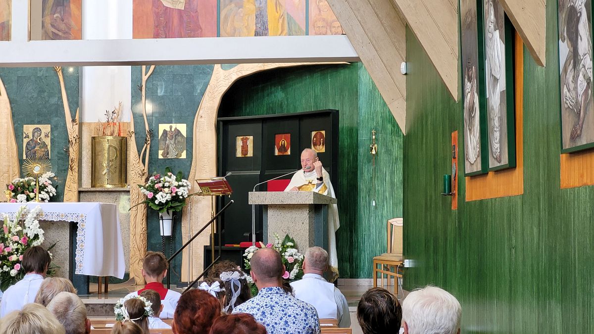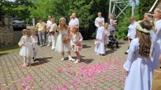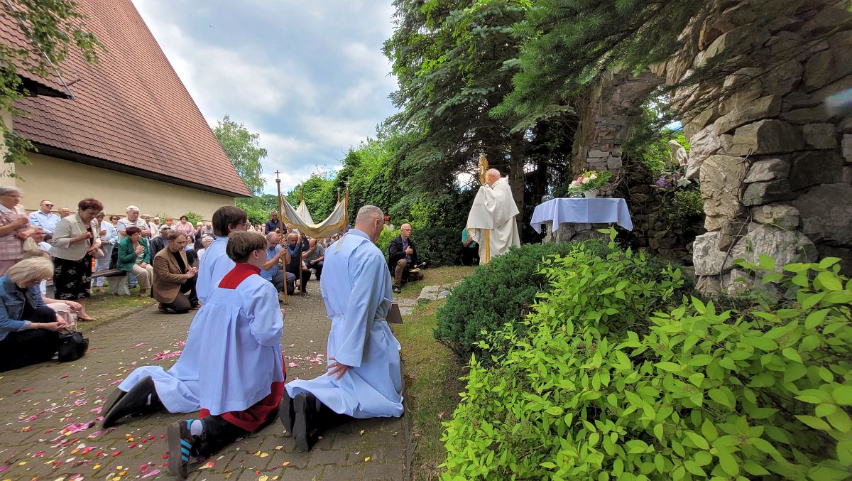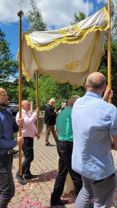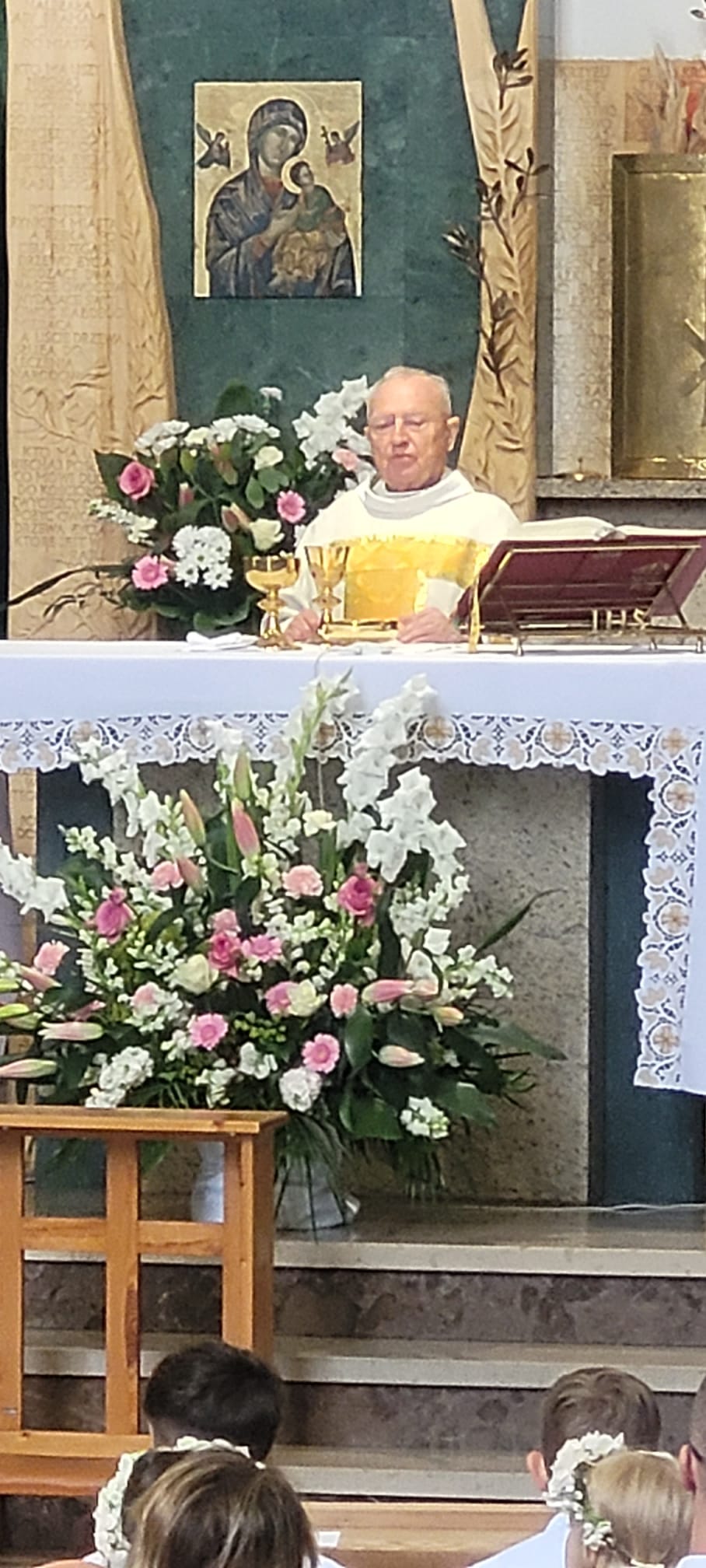W czwartek 19 czerwca obchodziliśmy uroczystość Najświętszego Ciała i Krwi Chrystusa. Po mszy świętej o godz. 11.00 wyruszyliśmy z procesją do czterech ołtarzy. W tym roku ze względu na chorobę Księdza Proboszcza, procesja odbywała się wokół kościoła. Przygotowaniem ołtarzy wokół kościoła zajęły się tylko 3 Panie z parafii. Tym bardziej należy się im wdzięczność za pracę i zaangażowanie, bo oprawa święta była uroczysta. Udział w procesji wzięły m.in. dzieci pierwszokomunijne i obchodzące rocznicę Pierwszej Komunii świętej w strojach komunijnych. Dziękujemy wszystkim osobom za niesienie feretronów, baldachimu, za przygotowanie dziewczynek do sypania kwiatów oraz za wszelką pomoc w przygotowanie uroczystości.