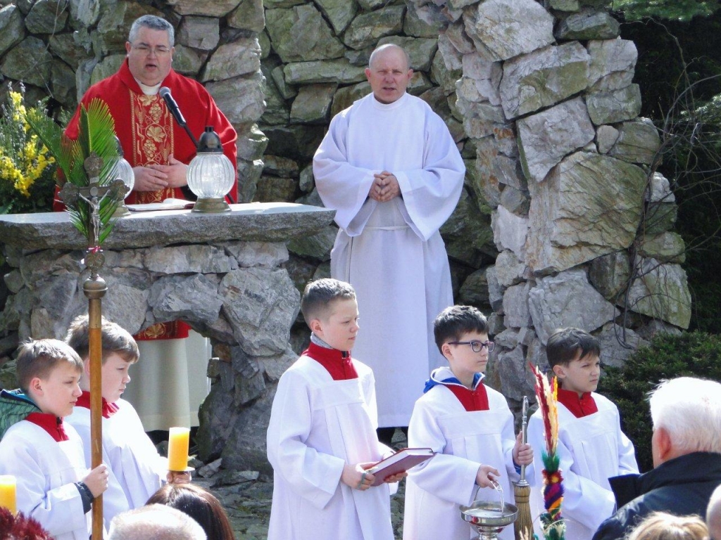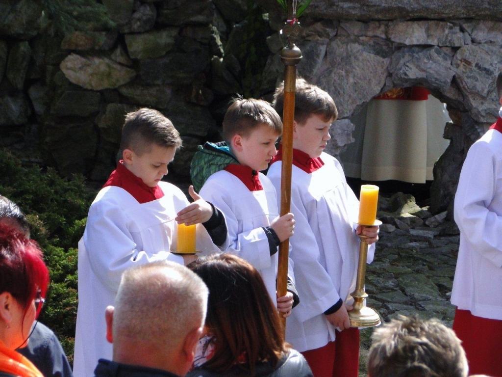 Opis radosnego wjazdu Chrystusa do Jerozolimy usłyszeliśmy przy grocie, a następnie rozpoczął się obrzęd poświęcenia palm, które są symbolem zwycięstwa Chrystusa nad śmiercią i uwydatniają głębokie znaczenie Męki Jezusa. Oto 2000 lat temu Król szedł dobrowolnie i uroczyście na śmierć, my zaś dzisiaj z palmami w rękach poszliśmy za Nim . Wierzymy bowiem, iż w osobie kapłana sam Chrystus wkracza do „Jerozolimy naszych serc”. Co tam napotka? Jakie słowa usłyszy? „Hosanna”? A może: „Ukrzyżuj”? Bo łatwo jest – jak mówił w homilii ks. Proboszcz – przejście w ludzkim sumieniu od krzyku HOSANNA do UKRZYŻUJ GO. Tak było 2 tysiące lat temu , tak jest dzisiaj.