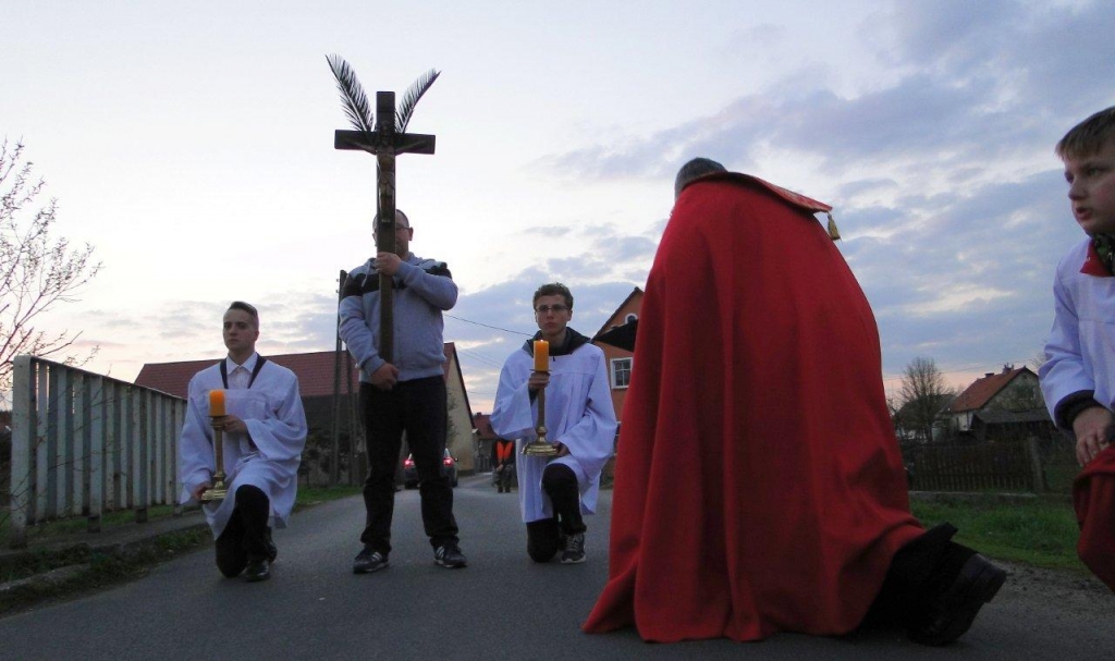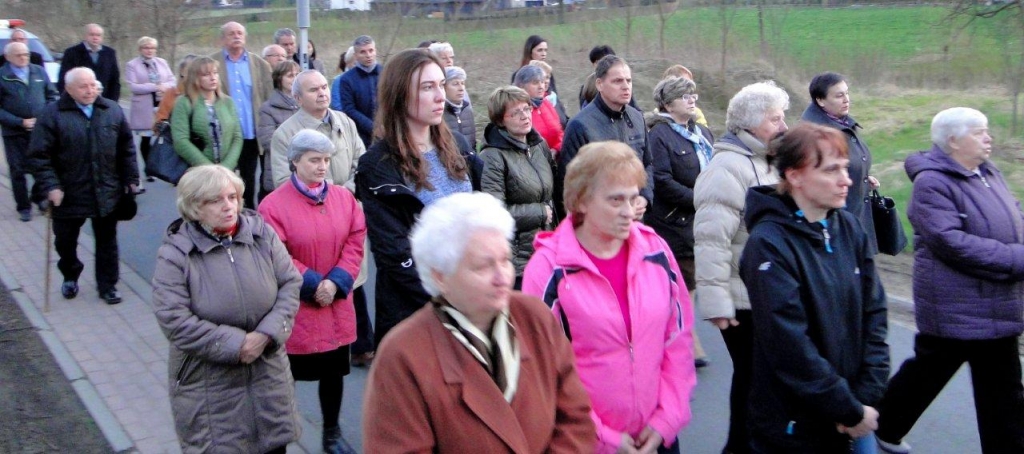 Rozpoczęła się przy krzyżu ustawionym na rozwidleniu ul. Czarnoleskiej, tuż po zakończeniu II wojny światowej, w roku 1946 przez polskich osadników, a zakończyła błogosławieństwem przy naszej świątyni. Idąc uliczkami rozważaliśmy kolejne stacje Męki Chrystusa, które przygotował ks. Proboszcz, natomiast pan Dariusz Bak przewodniczył śpiewom pieśni pasyjnych.