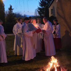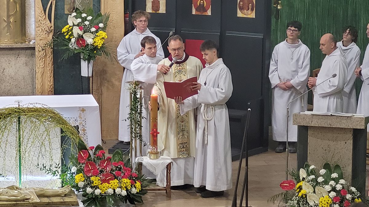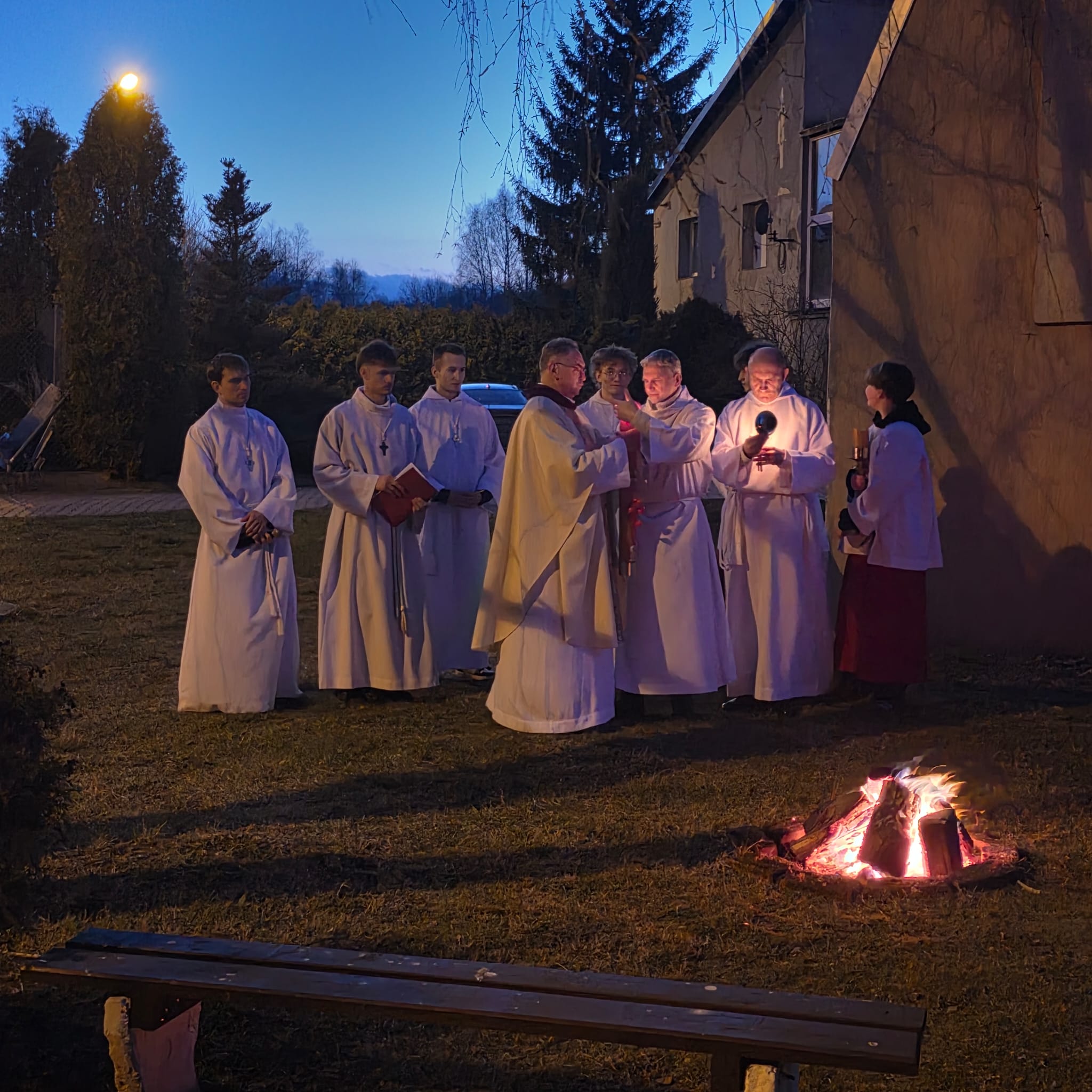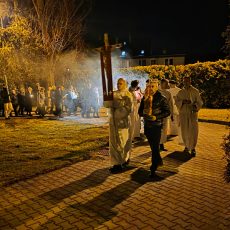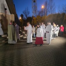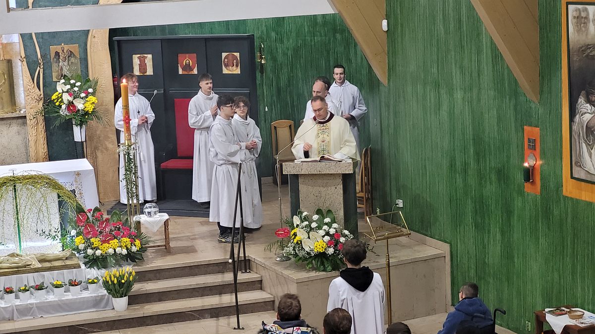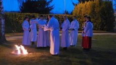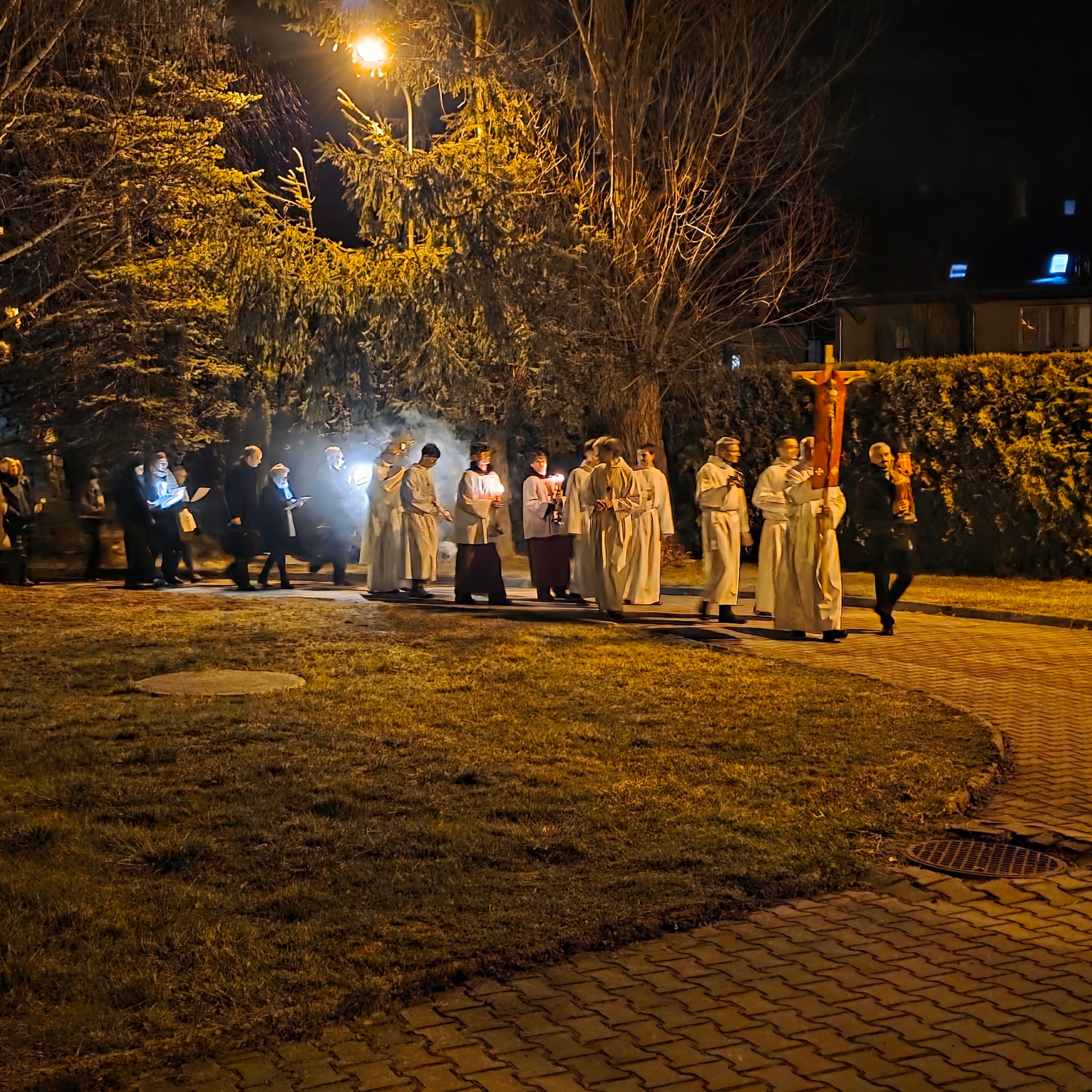 O godz. 20:00 pod przewodnictwem Ks. Proboszcza Tomasza Biszko, rozpoczęła się najuroczystsza ze mszy w roku liturgicznym, liturgia Wielkiej Soboty. Rozpoczęła się od poświęcenia ognia i paschału przy grocie Maryi. Następnie już w świątyni zapaliliśmy przyniesione przez nas świece od tego paschału, które zostały także poświęcone. Liturgia słowa obejmowała duże bogactwo czytań obejmujące dzieje przymierza Boga z ludźmi od stworzenia świata aż po zmartwychwstanie Pana Jezusa. Niektóre czytania ubogacał śpiewem chór JUDA CANTORES. Potem, po odmówieniu litanii do wszystkich Świętych odnowiliśmy przyrzeczenia chrzcielne. Pod koniec liturgii udaliśmy się na procesję dookoła świątyni, radośnie sławiąc Boga za zmartwychwstanie.