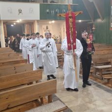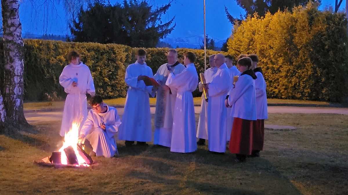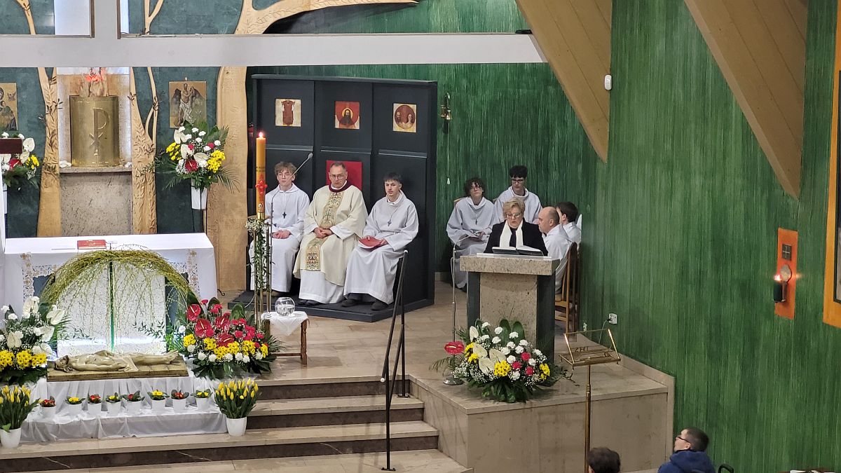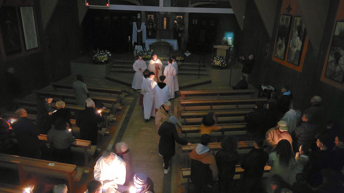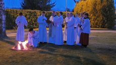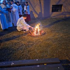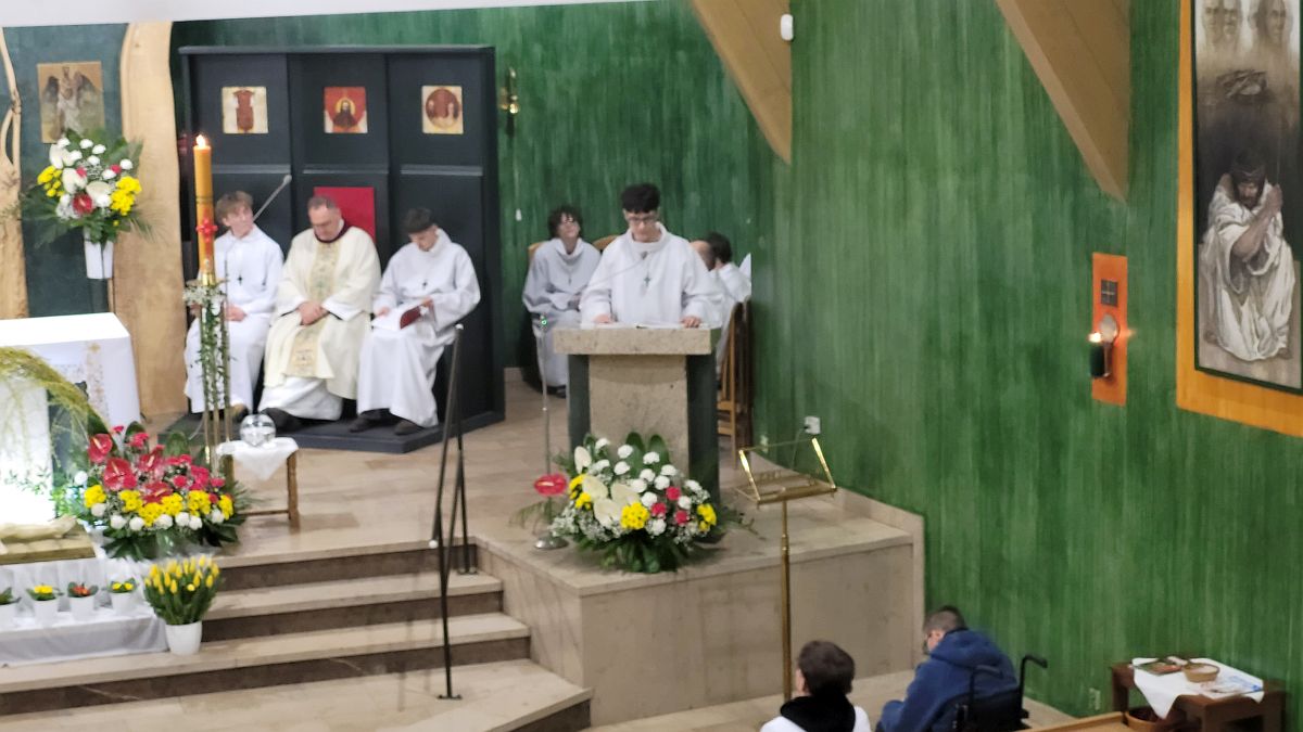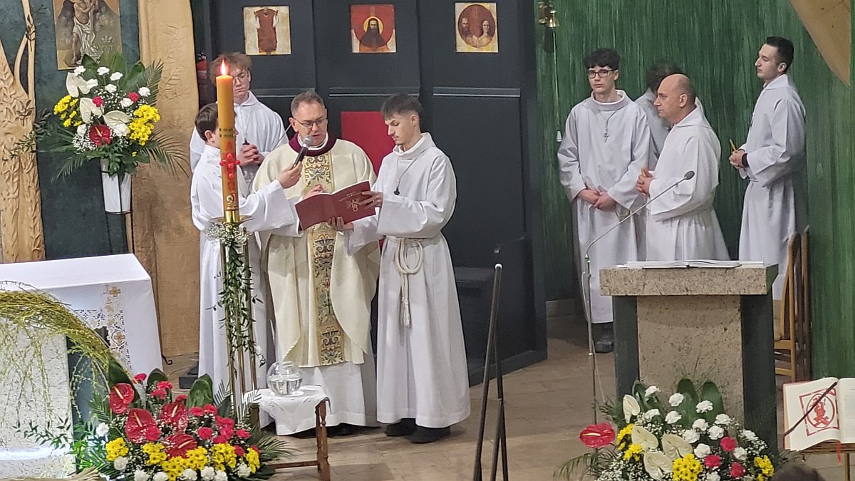 O godz. 20:00 pod przewodnictwem Ks. Proboszcza Tomasza Biszko, rozpoczęła się najuroczystsza ze mszy w roku liturgicznym, liturgia Wielkiej Soboty. Rozpoczęła się od poświęcenia ognia i paschału przy grocie Maryi. Następnie już w świątyni zapaliliśmy przyniesione przez nas świece od tego paschału, które zostały także poświęcone. Liturgia słowa obejmowała duże bogactwo czytań obejmujące dzieje przymierza Boga z ludźmi od stworzenia świata aż po zmartwychwstanie Pana Jezusa. Niektóre czytania ubogacał śpiewem chór JUDA CANTORES. Potem, po odmówieniu litanii do wszystkich Świętych odnowiliśmy przyrzeczenia chrzcielne. Pod koniec liturgii udaliśmy się na procesję dookoła świątyni, radośnie sławiąc Boga za zmartwychwstanie.