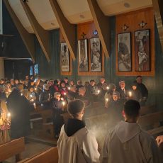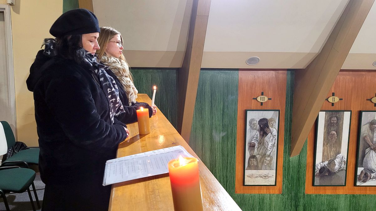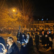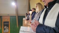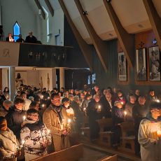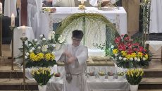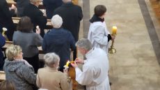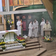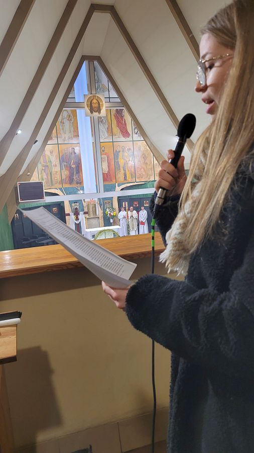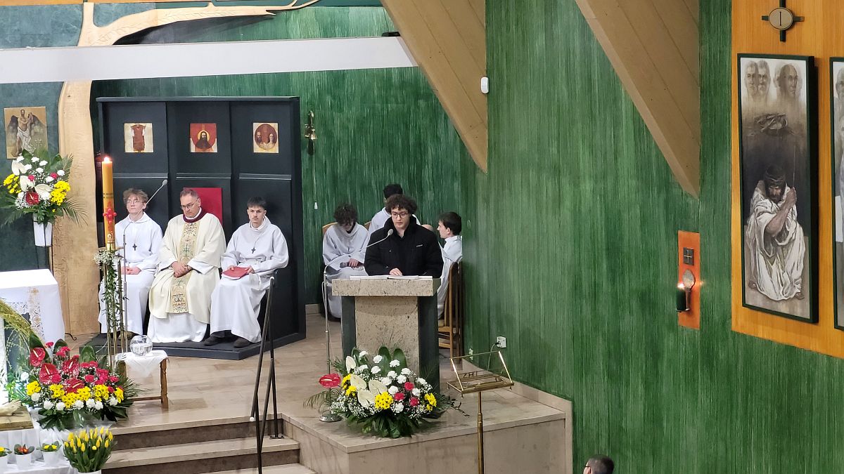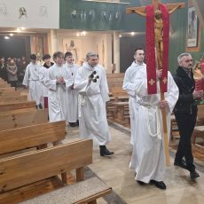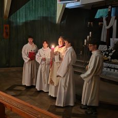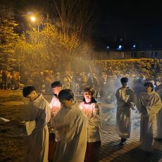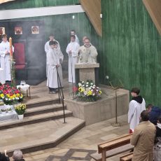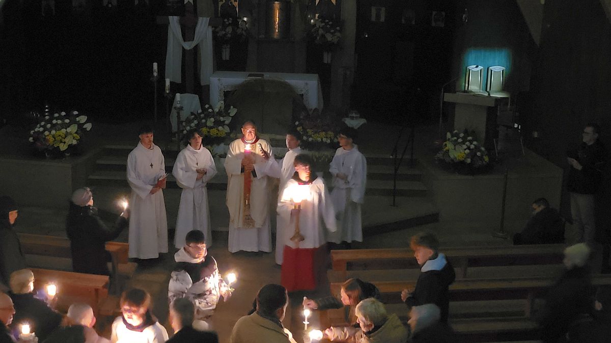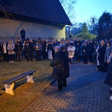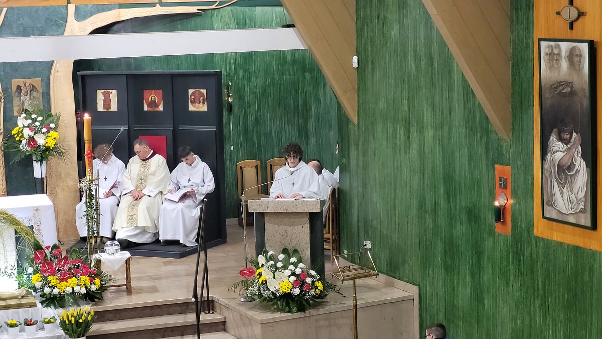O godz. 20:00 pod przewodnictwem Ks. Proboszcza Tomasza Biszko, rozpoczęła się najuroczystsza ze mszy w roku liturgicznym, liturgia Wielkiej Soboty. Rozpoczęła się od poświęcenia ognia i paschału przy grocie Maryi. Następnie już w świątyni zapaliliśmy przyniesione przez nas świece od tego paschału, które zostały także poświęcone. Liturgia słowa obejmowała duże bogactwo czytań obejmujące dzieje przymierza Boga z ludźmi od stworzenia świata aż po zmartwychwstanie Pana Jezusa. Niektóre czytania ubogacał śpiewem chór JUDA CANTORES. Potem, po odmówieniu litanii do wszystkich Świętych odnowiliśmy przyrzeczenia chrzcielne. Pod koniec liturgii udaliśmy się na procesję dookoła świątyni, radośnie sławiąc Boga za zmartwychwstanie.