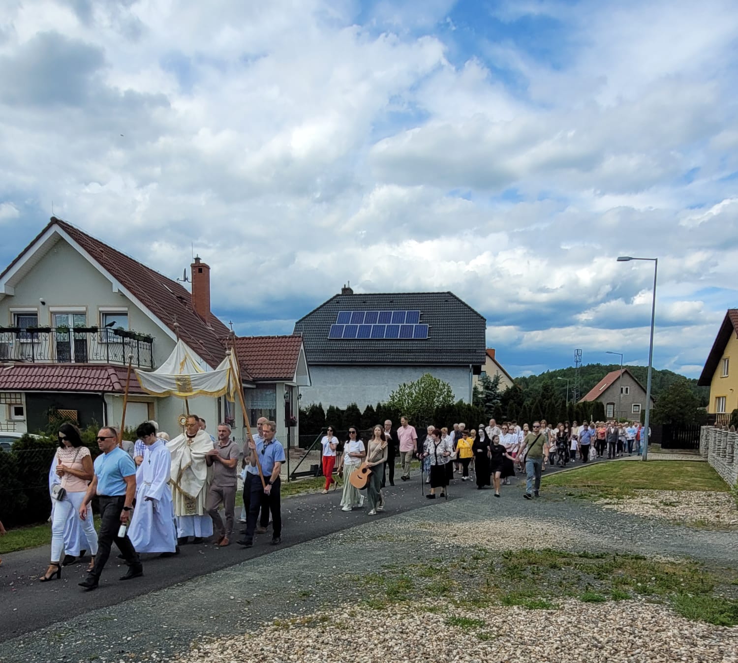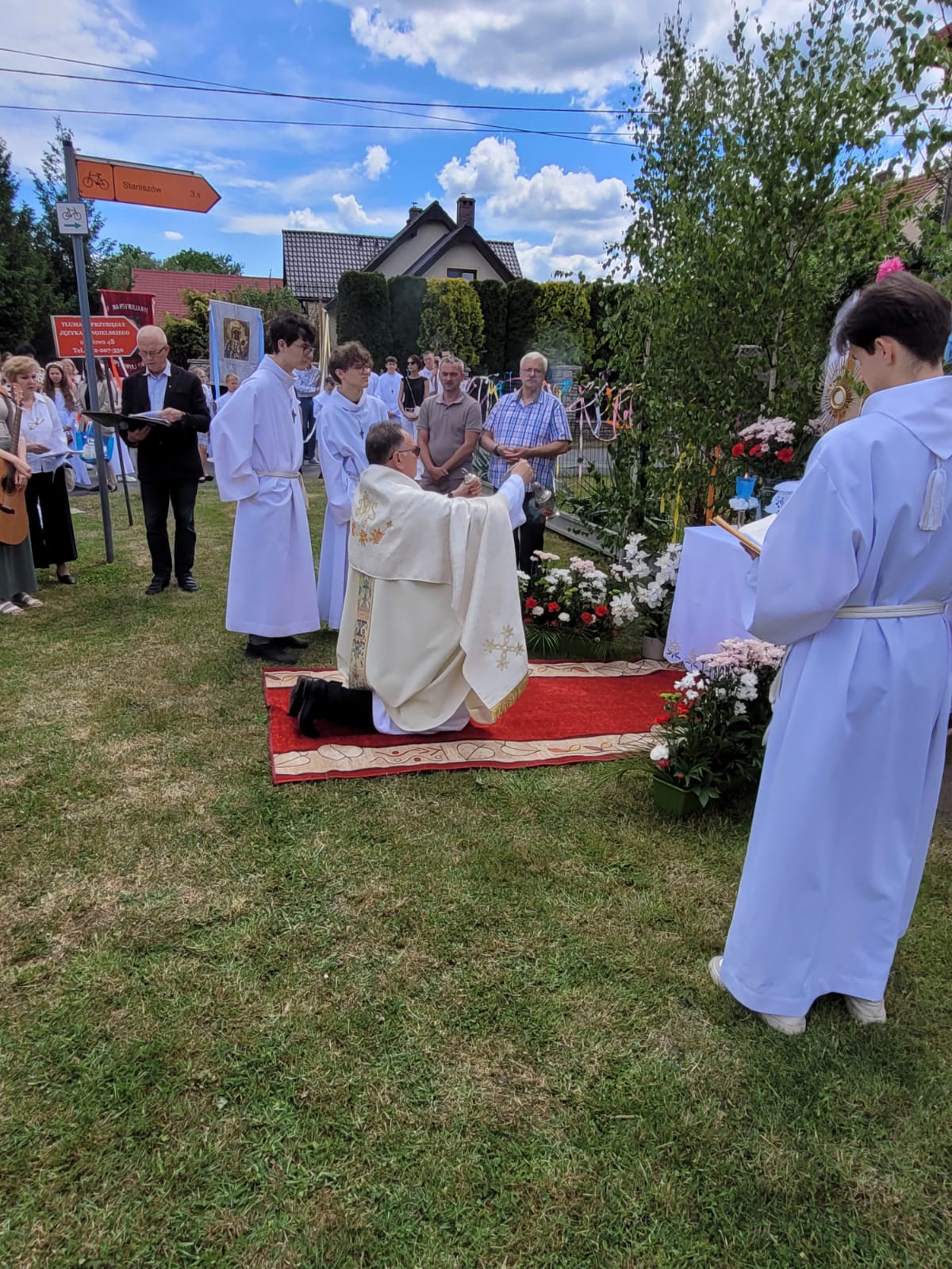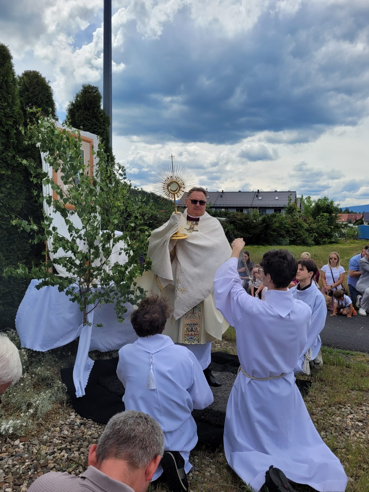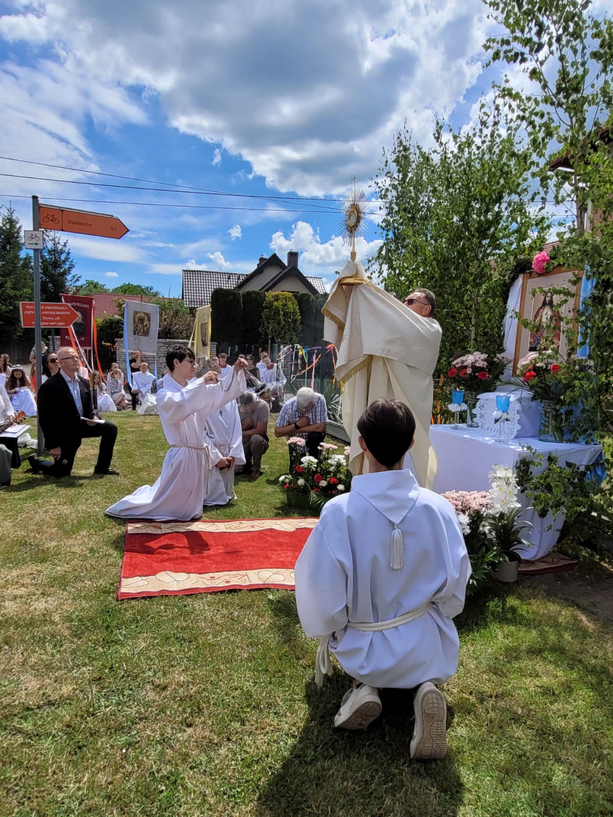W czwartek 30 maja obchodziliśmy uroczystość Najświętszego Ciała i Krwi Chrystusa. Po mszy świętej o godz. 11.00 wyruszyliśmy z procesją do czterech ołtarzy. Przeszliśmy ulicami: Czarnoleską, Nową, Jaśminową, i znów Czarnoleską, powracając do naszej świątyni. Liczny udział w procesji wzięli mieszkańcy osiedla Czarne, dzieci pierwszokomunijne i obchodzące rocznicę Pierwszej Komunii Świętej, idąc w strojach komunijnych. Niesione były też feretrony i baldachimu zaś dziewczynki tradycyjnie sypały kwiaty na drodze proceji. Dziękujemy wszystkim, dzięki których pracy i zaangażowaniu, ten dzień był dla nas niezwykły, pełen chwały i błogosławieństwa Bożego.