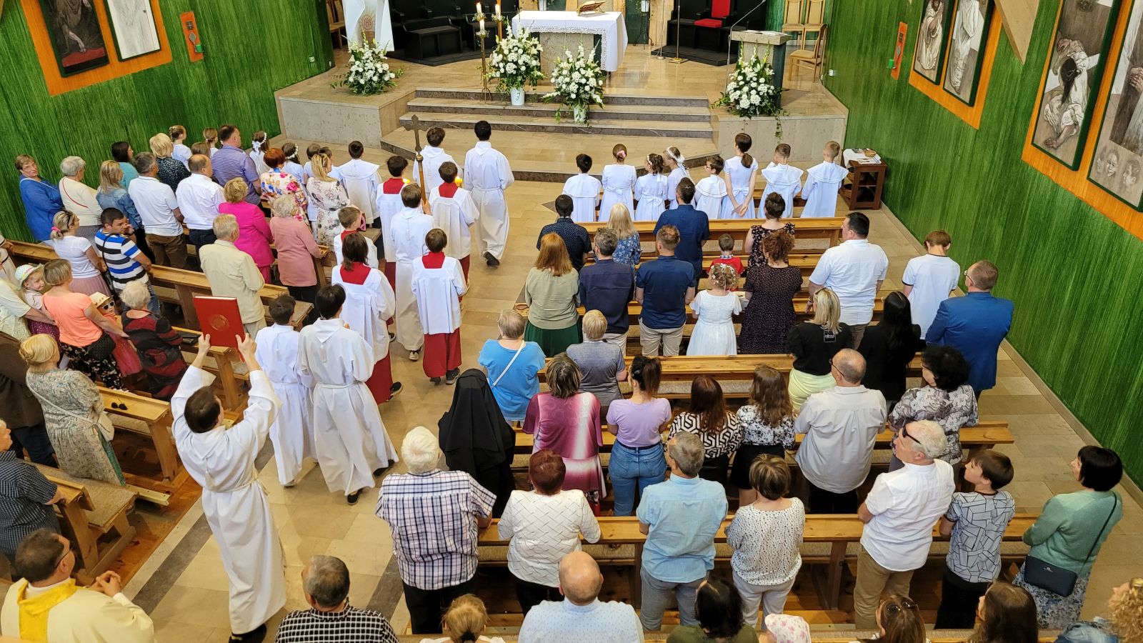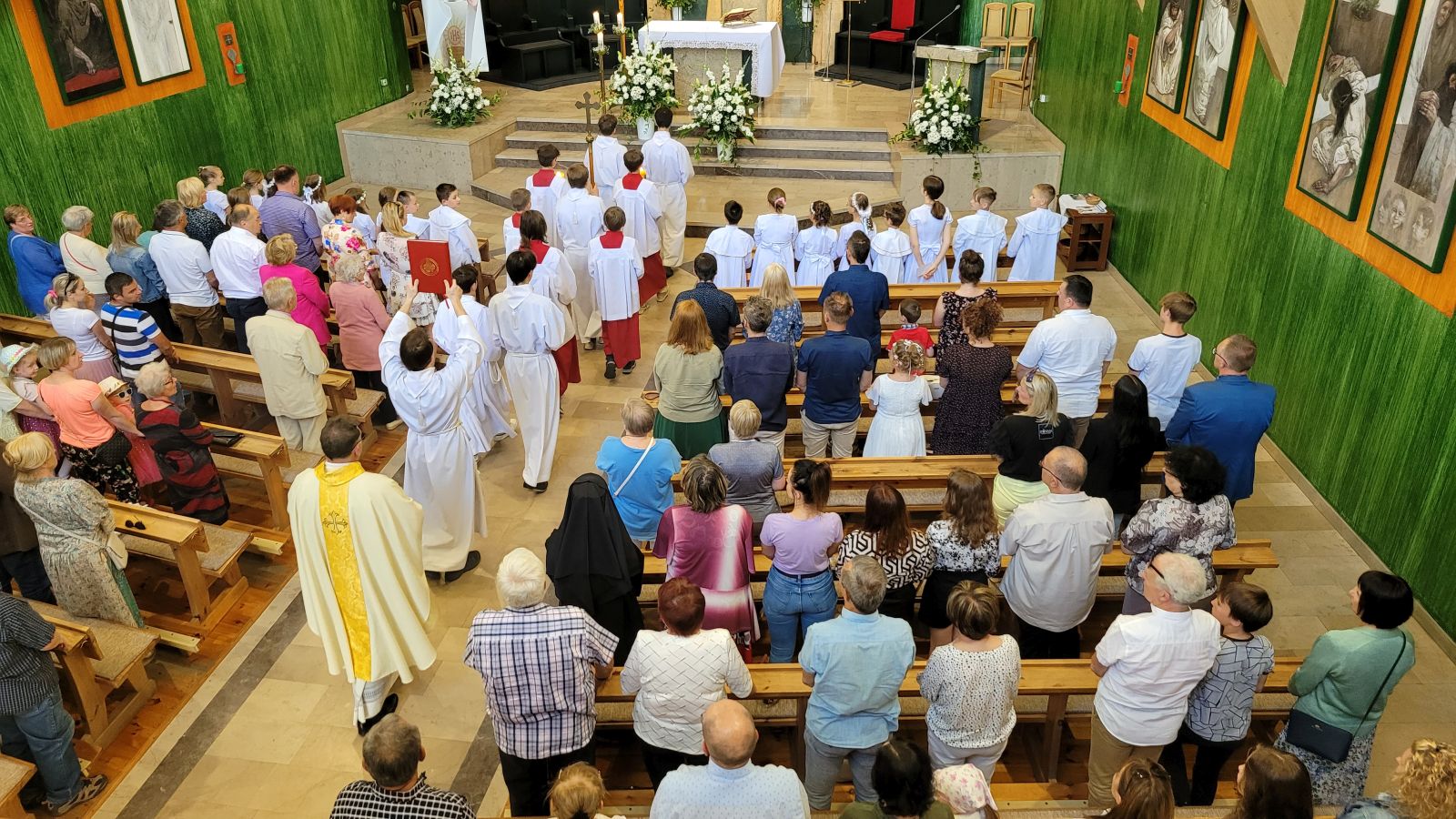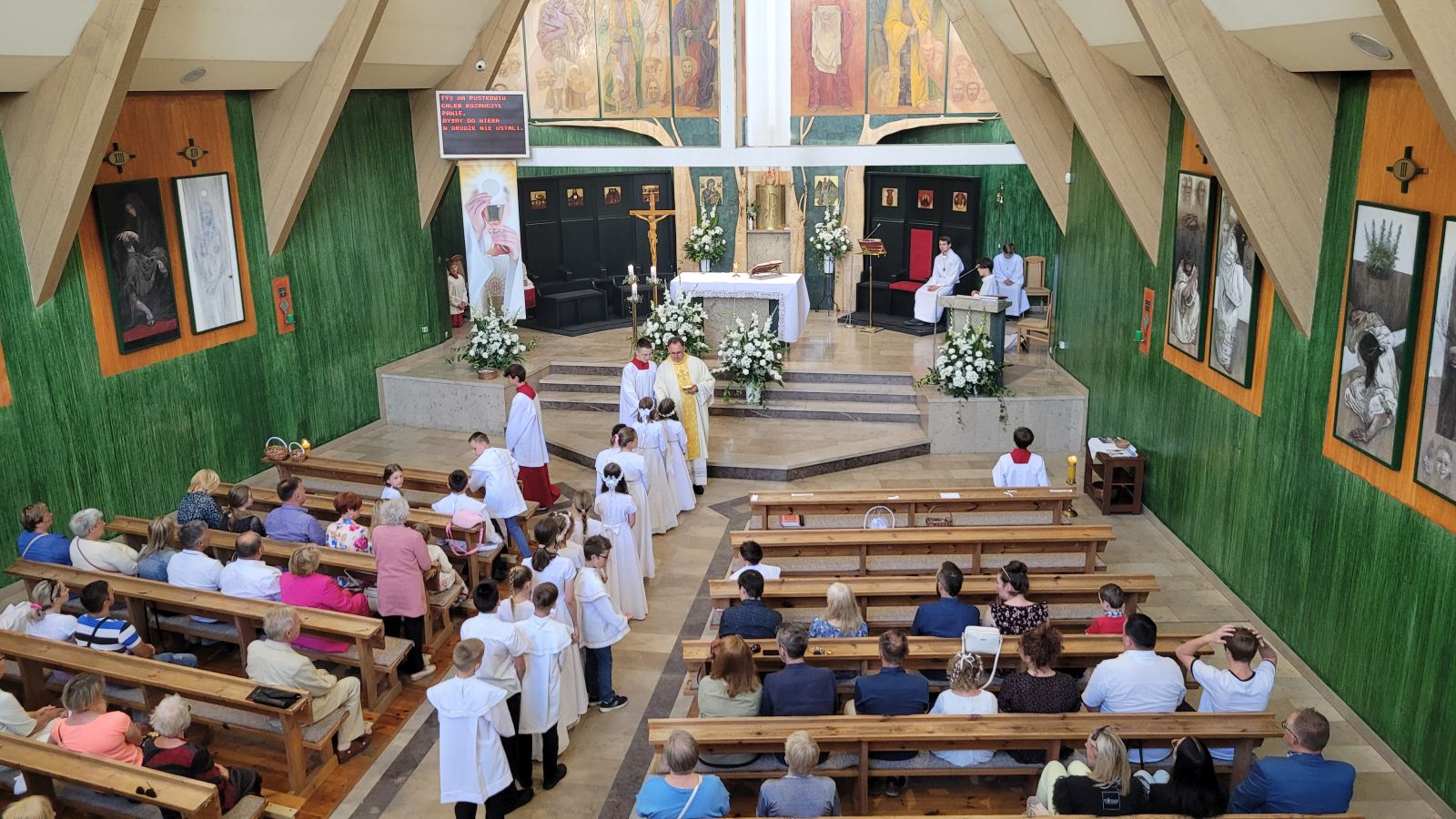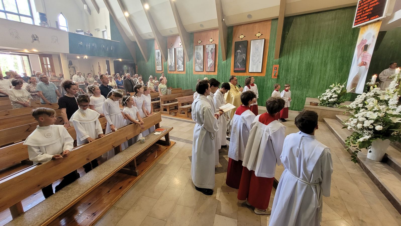 W czwartek 8-06, Kościół obchodził uroczystość Najświętszego Ciała i Krwi Chrystusa. Po mszy świętej o godz. 11.00 wyruszyliśmy z procesją do czterech ołtarzy. Przeszliśmy ulicami: Strumykową, Orzeszkowej, Podleśną, Orzeszkowej i Strumykową, po czym wróciliśmy do naszej świątyni. Udział w procesji wzięły między innymi dzieci pierwszokomunijne i obchodzące rocznicę Pierwszej Komunii Świętej, idąc w strojach komunijnych. Niesione były też tradycyjnie feretrony, baldachim, zaś dziewczynki przy asyście rodziców sypały kwiaty.