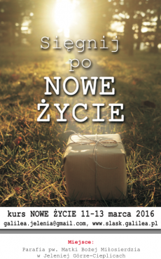 Wspólnota Chrystusa Zmartwychwstałego „GALILEA” z Jeleniej Góry serdecznie zaprasza na rekolekcje – Kurs Nowe Życie, prowadzony przez Szkołę Nowej Ewangelizacji św. Marka ze Stryszawy z pomocą Odnowy w Duchu Świętym „Bogaci w miłosierdzie”. Kurs odbędzie się w dniach 11-13 marca 2016 r. w parafii pw. Matki Bożej Miłosierdzia w Jeleniej Górze-Cieplicach.