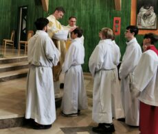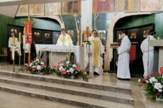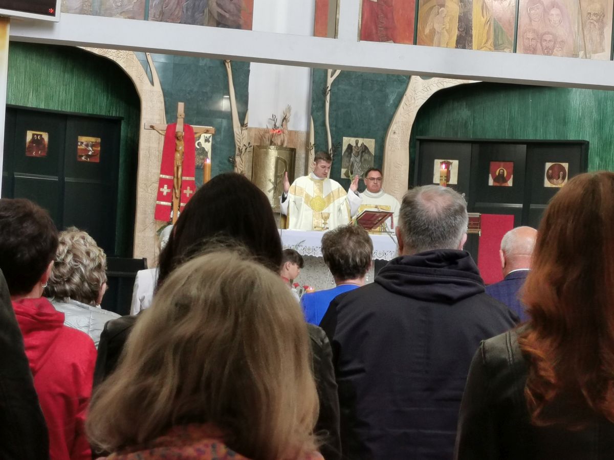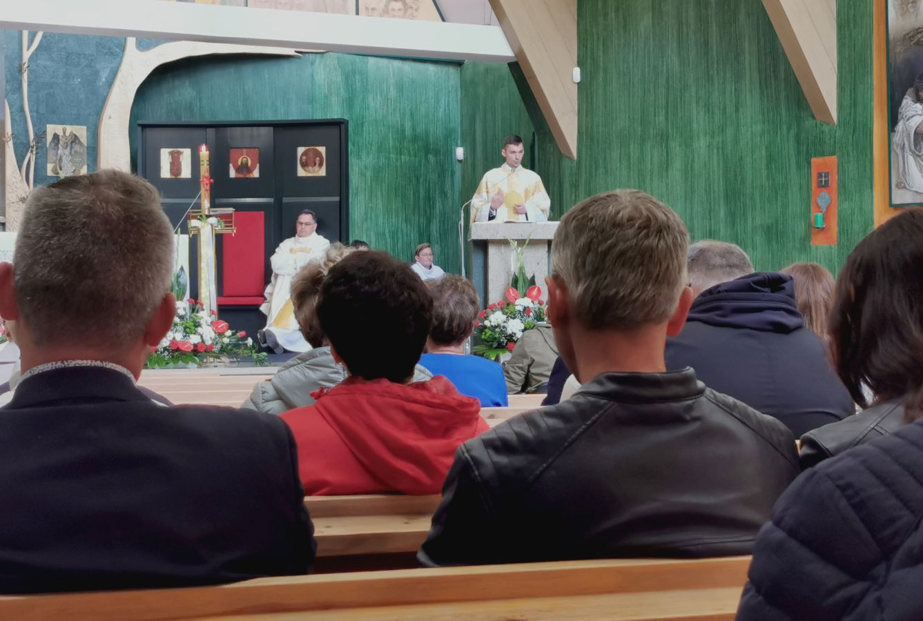 Szczególnie uroczysty wymiar miała msza święta o godz. 12:30, która sprawowana była przez neoprezbitera, Krzysztofa Borysiewicza, w intencji ks. Tomasza z okazji 24 rocznicy święceń kapłańskich, a Ksiądz Proboszcz modlił się w intencji ks. Krzysztofa. Liturgia sprawowana przez Księdza Prymicjanta była niezwykle podniosła. Młody kapłan wygłosił płomienną, poruszającą serce, homilię.