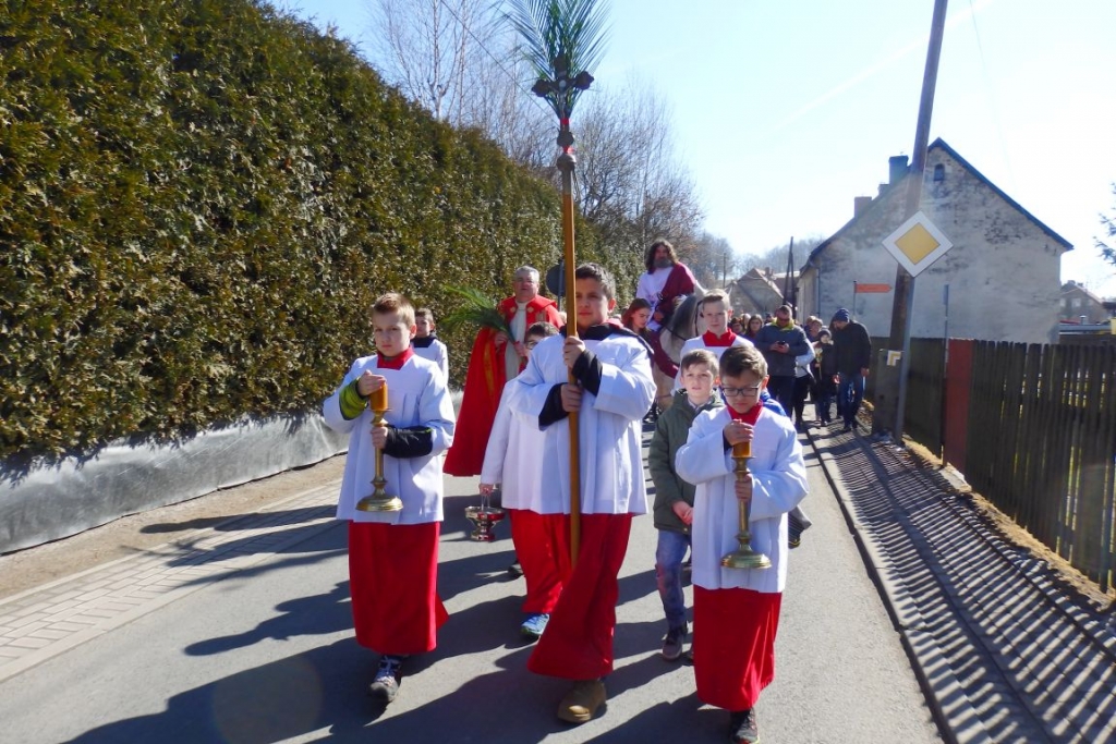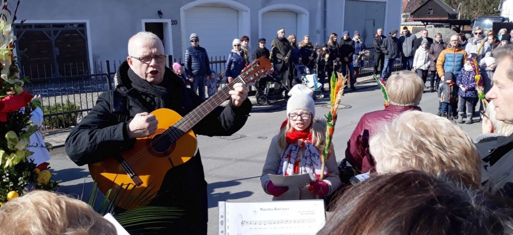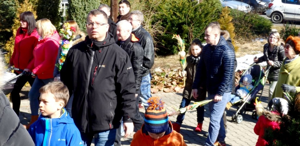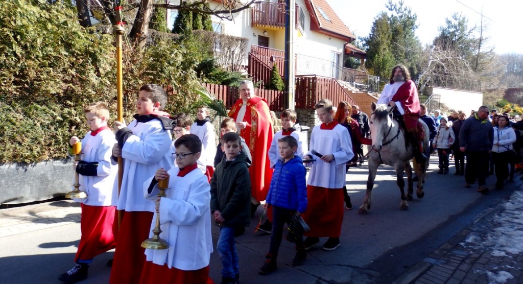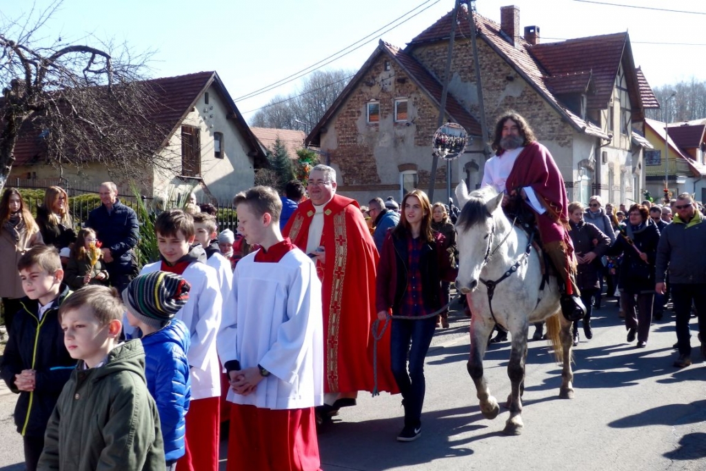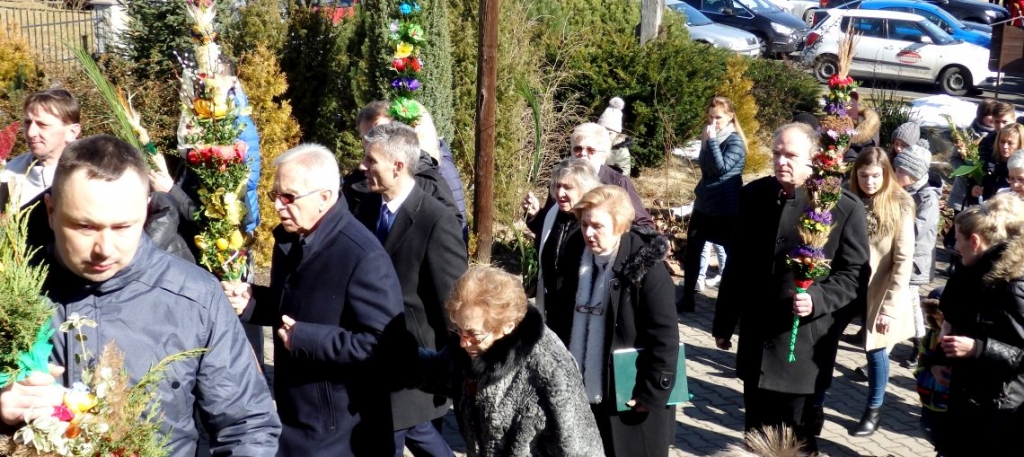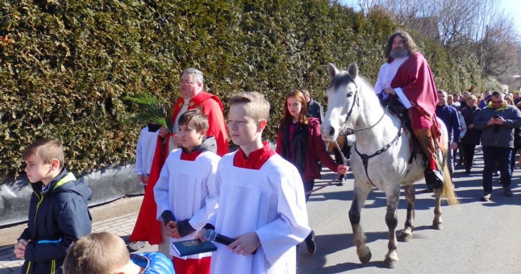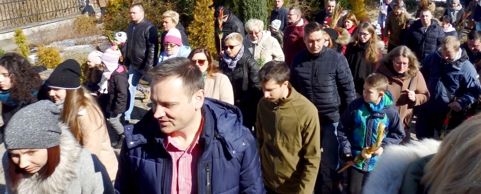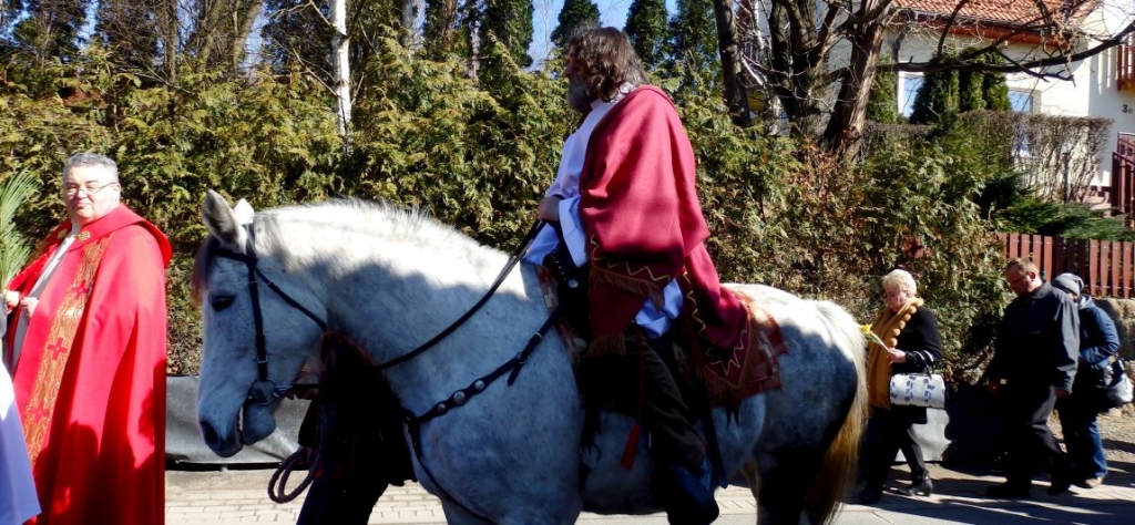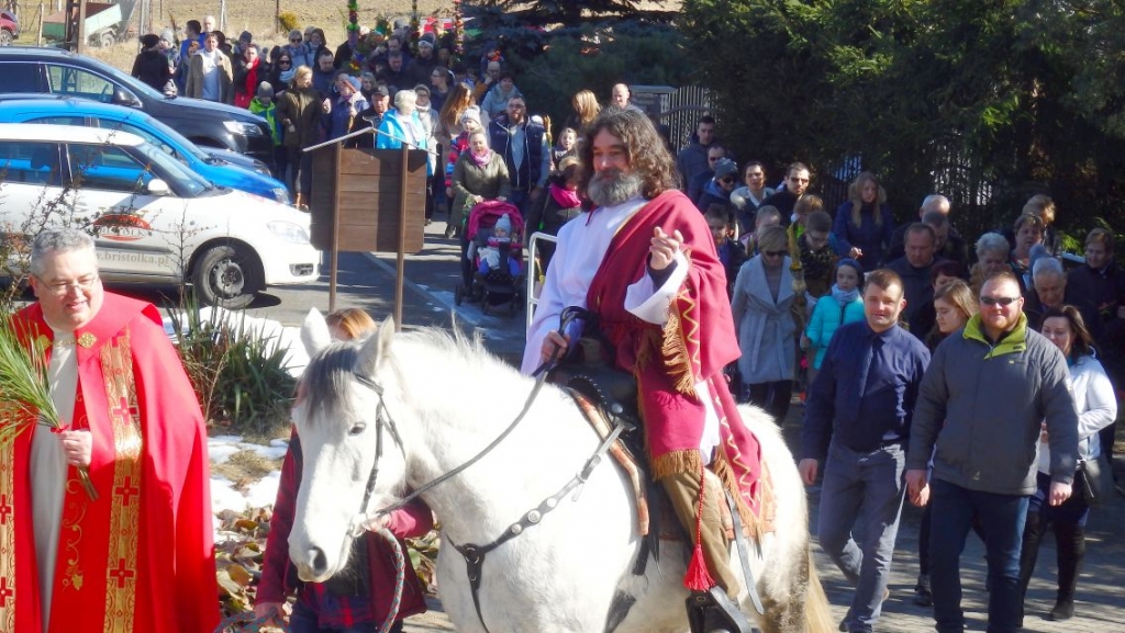 Niedziela Palmowa rozpoczęła obchody Wielkiego Tygodnia, którego kulminacją będzie Triduum Paschalne. Do uczestnictwa w tej wyjątkowej liturgii szczególnie mocno zachęcał ks. Proboszcz. Po raz pierwszy procesję z palmami ubogaciła inscenizacja wjazdu Jezusa do Jerozolimy. Pan Andrzej Miętus wcielił się w rolę Zbawiciela, jadąc na koniu, który zastąpił „upartego osła”, albowiem nie chciał on wejść na platformę transportową. Wszystko to było możliwe dzięki życzliwości pana dyrektora Zespołu Szkół Przyrodniczo – Usługowych oraz pana Przemysława Spychalskiego, który zorganizował udział konia w tej inscenizacji. Wspólnym śpiewom podczas procesji z palmami i uroczystej Eucharystii przewodniczył chór „Juda Cantores” pod dyrekcją pana Marka Niewiadomskiego.
