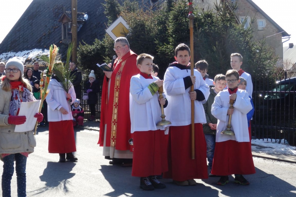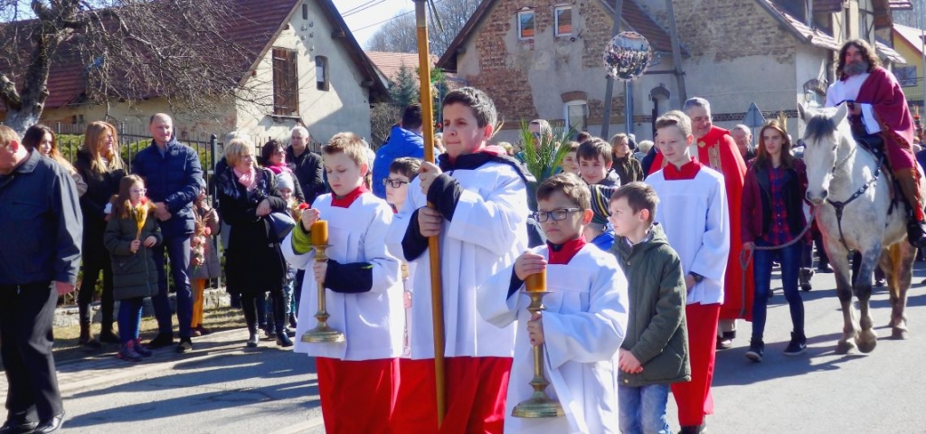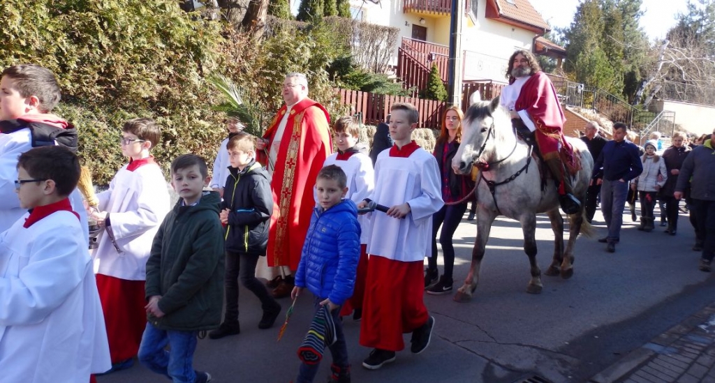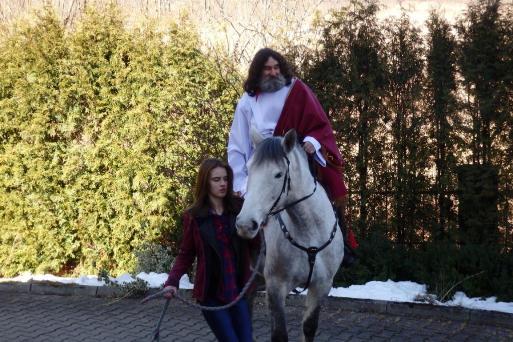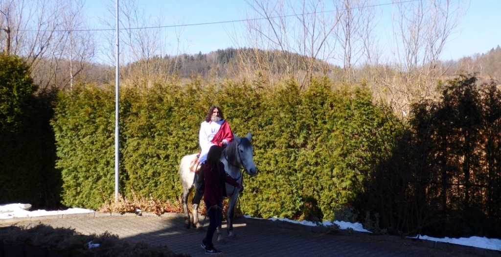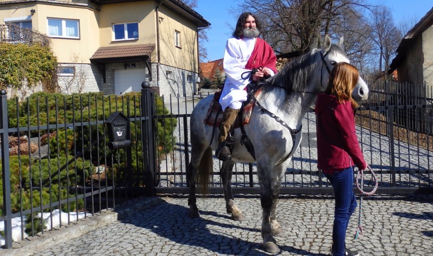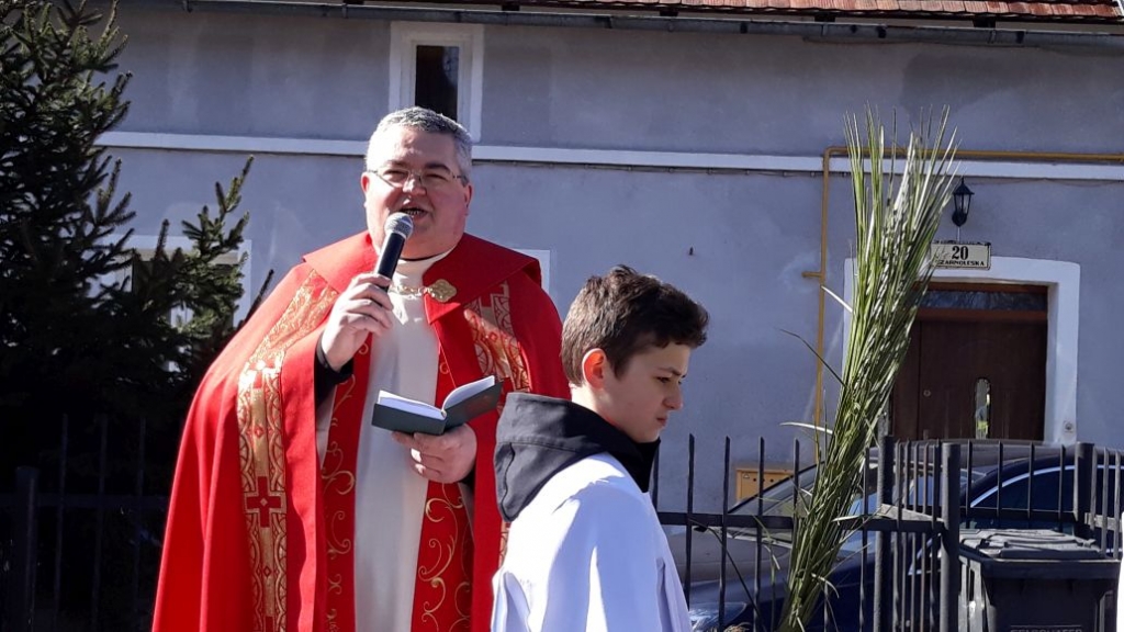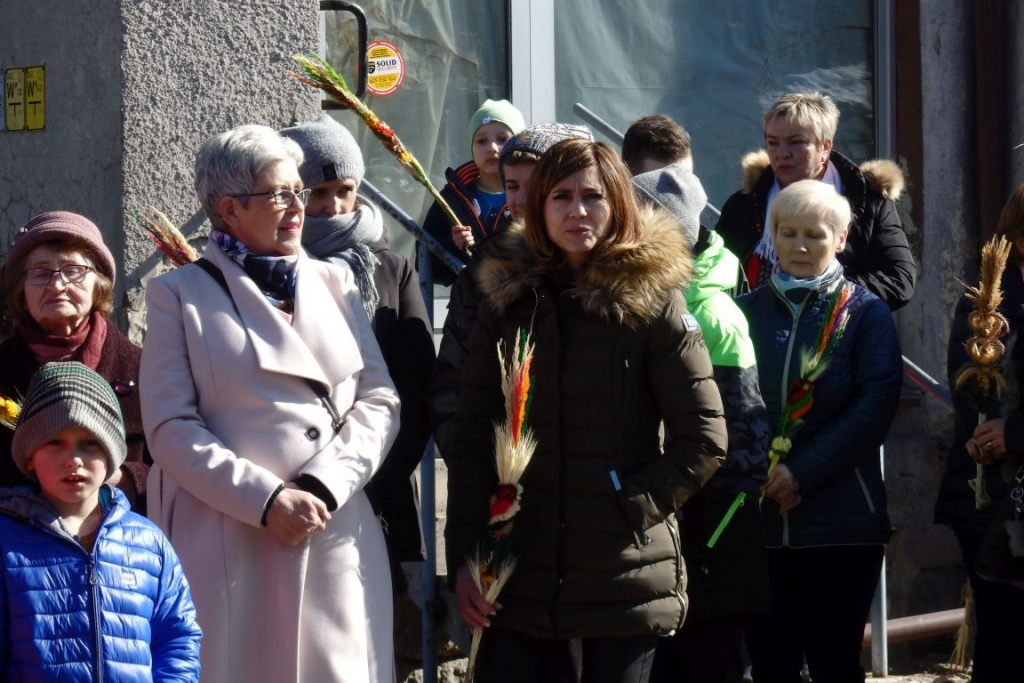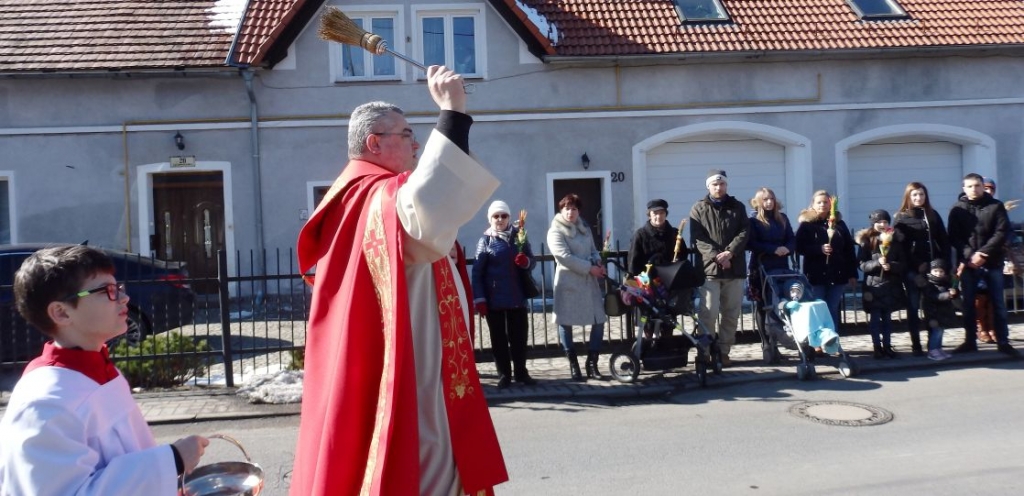 Niedziela Palmowa rozpoczęła obchody Wielkiego Tygodnia, którego kulminacją będzie Triduum Paschalne. Do uczestnictwa w tej wyjątkowej liturgii szczególnie mocno zachęcał ks. Proboszcz. Po raz pierwszy procesję z palmami ubogaciła inscenizacja wjazdu Jezusa do Jerozolimy. Pan Andrzej Miętus wcielił się w rolę Zbawiciela, jadąc na koniu, który zastąpił „upartego osła”, albowiem nie chciał on wejść na platformę transportową. Wszystko to było możliwe dzięki życzliwości pana dyrektora Zespołu Szkół Przyrodniczo – Usługowych oraz pana Przemysława Spychalskiego, który zorganizował udział konia w tej inscenizacji. Wspólnym śpiewom podczas procesji z palmami i uroczystej Eucharystii przewodniczył chór „Juda Cantores” pod dyrekcją pana Marka Niewiadomskiego.