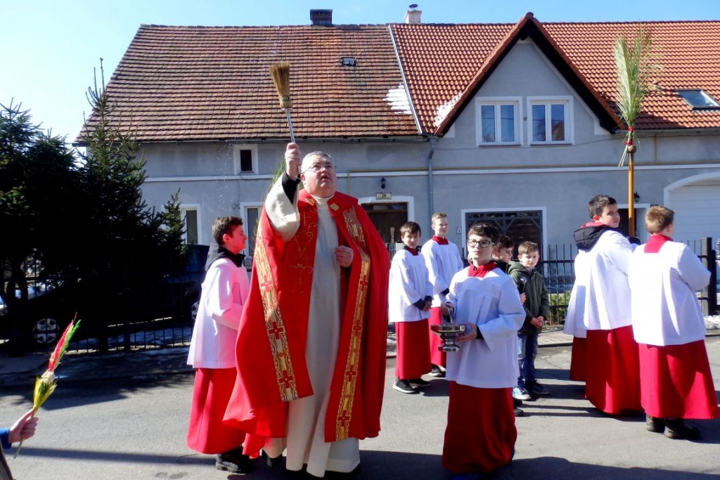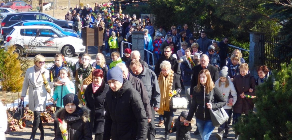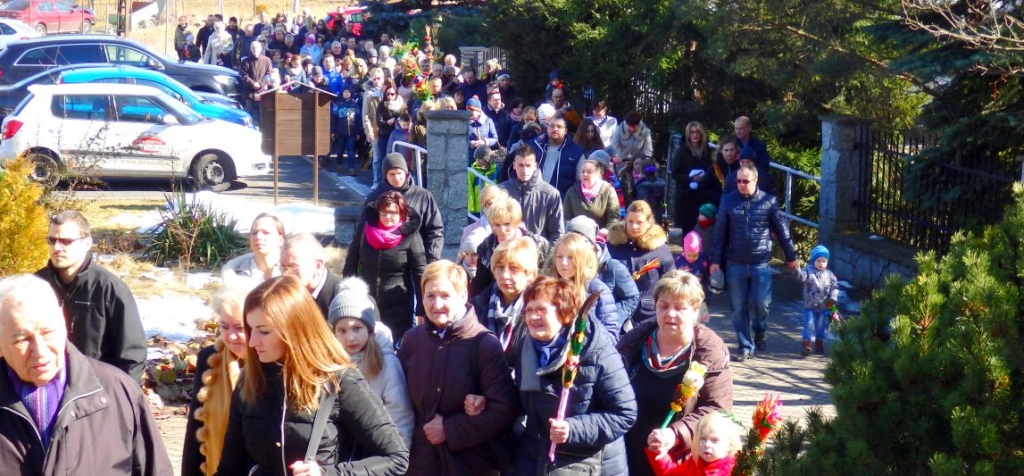 Opis radosnego wjazdu Chrystusa do Jerozolimy usłyszeliśmy przy domu, w którym 40 lat temu została odprawiona pierwsza Eucharystia na Czarnem. Następnie rozpoczął się obrzęd błogosławieństwa palm, które są symbolem zwycięstwa Chrystusa nad śmiercią i uwydatniają głębokie znaczenie Męki Jezusa. Oto 2000 lat temu Jezus – Król wjeżdżał uroczyście do świętego Jeruzalem, by tam złożyć siebie w ofierze swojemu Ojcu za nasze grzechy. My zaś dzisiaj, z palmami w rękach poszliśmy za Nim. Wierzymy, bowiem, iż w osobie kapłana sam Chrystus wkracza do „Jerozolimy naszych serc”. Co tam napotka? Jakie słowa usłyszy? „Hosanna”? A może: „Ukrzyżuj”? Bo łatwo jest przejść w ludzkim sumieniu od krzyku HOSANNA do UKRZYŻUJ Go.